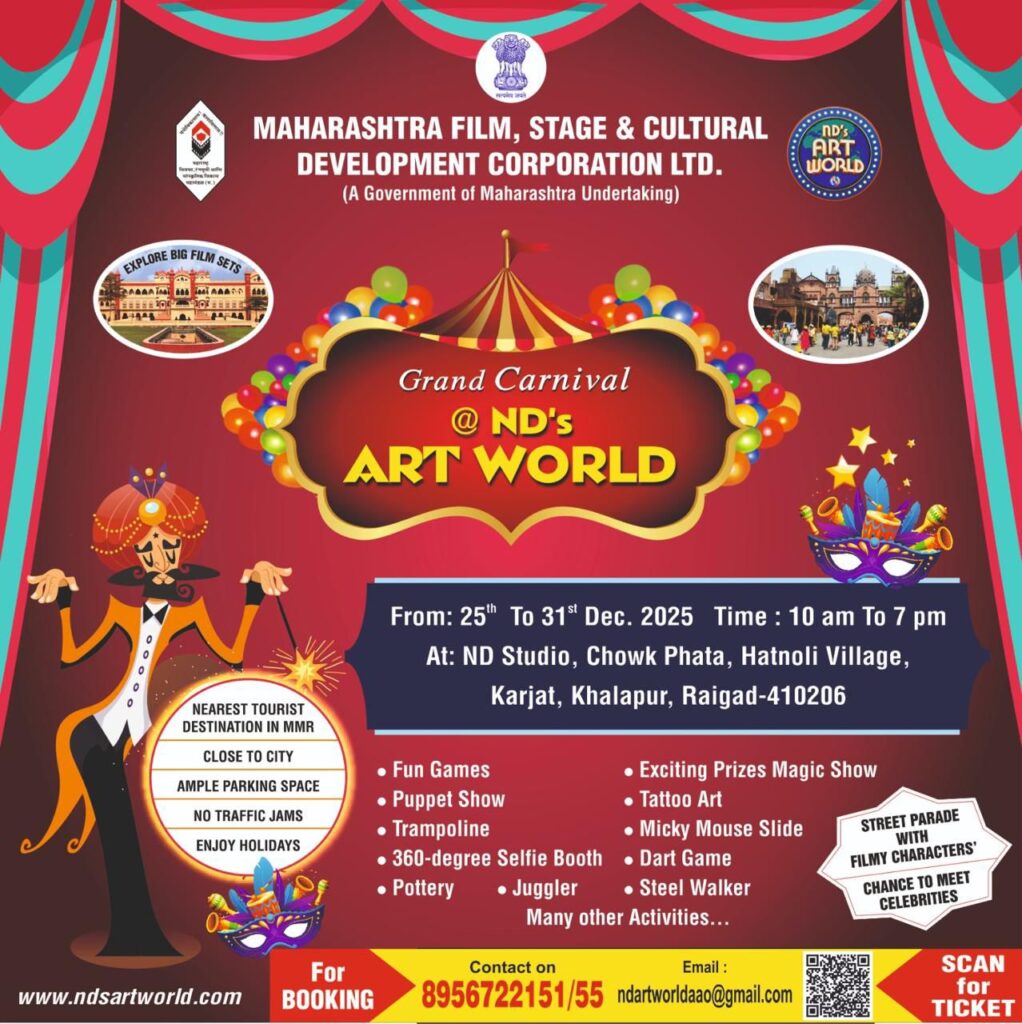 मुंबई, ता. २३ : महाराष्ट्र चित्रपट रंगभूमी आणि सांस्कृतिक विकास महामंडळातर्फे २५ ते ३१ डिसेंबरपर्यंत कर्जत-खालापूर येथील एन. डी. स्टुडिओ येथे सकाळी १० ते ६ पर्यंत कार्निवलचे आयोजन करण्यात आले आहे. या कार्निवलमध्ये खेळ, मनोरंजनासह सेलिब्रेटीसोबत गप्पाचा कार्यक्रम नियमितपणे संपन्न होणार आहे. त्यामुळे वर्षाखेरीस कौटुंबिक पर्यटनाचा आनंद लूटता येणार आहे.