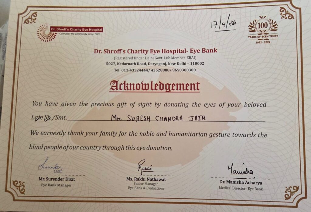 “In a moment of profound grief, you and your family demonstrated extraordinary courage and compassion by choosing to donate the eyes of your beloved father, Shri Suresh Chandra Jain. I express my deepest admiration and heartfelt gratitude for this noble act. Your decision reflects the highest spirit of humanity. Through this gift of light, Shri Jain will continue to illuminate lives, and his legacy will live on in the vision he has restored and the hope he has created.”